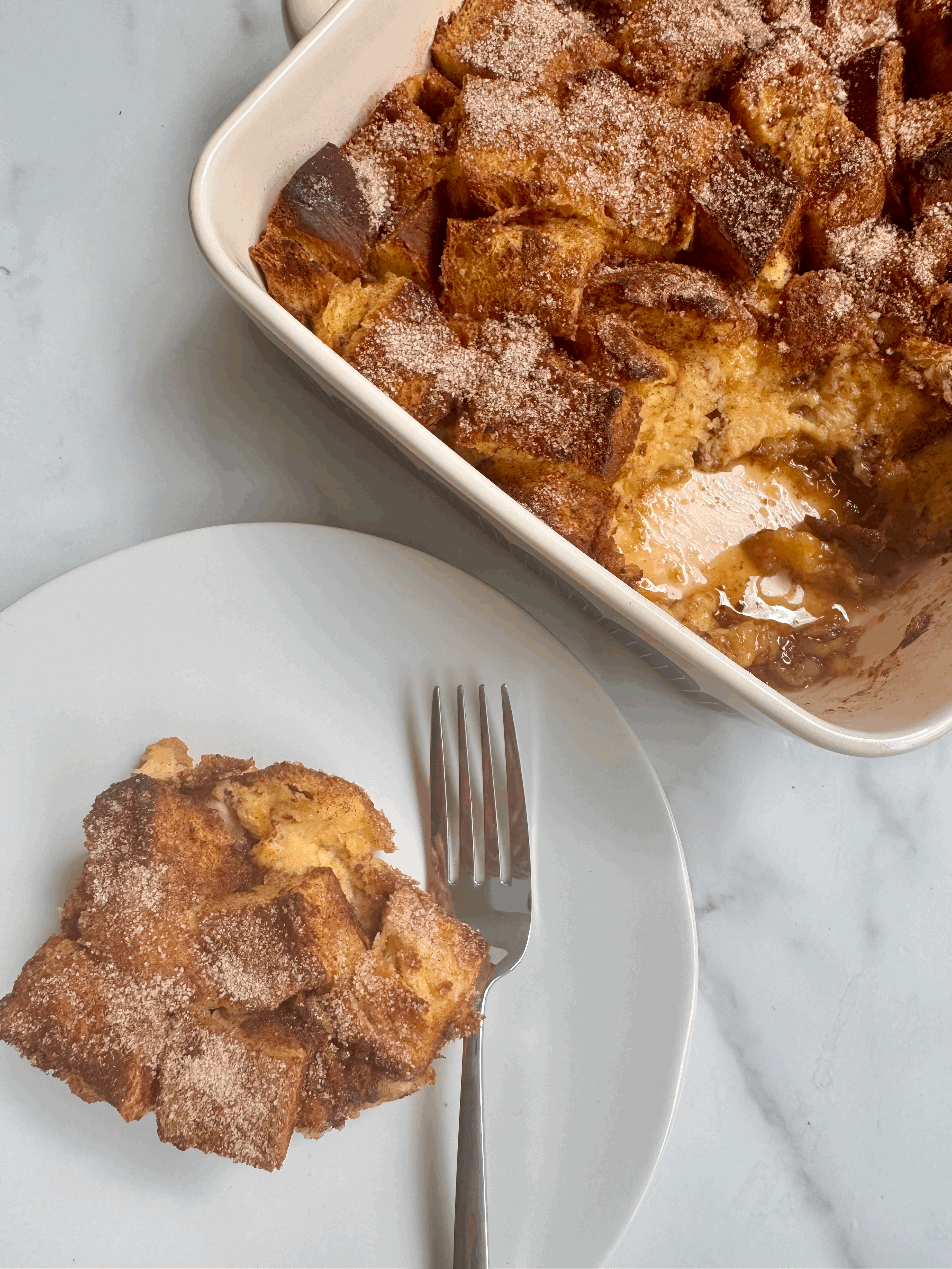 Golden, fluffy French toast casserole with a buttery caramel layer baked right into the bottom