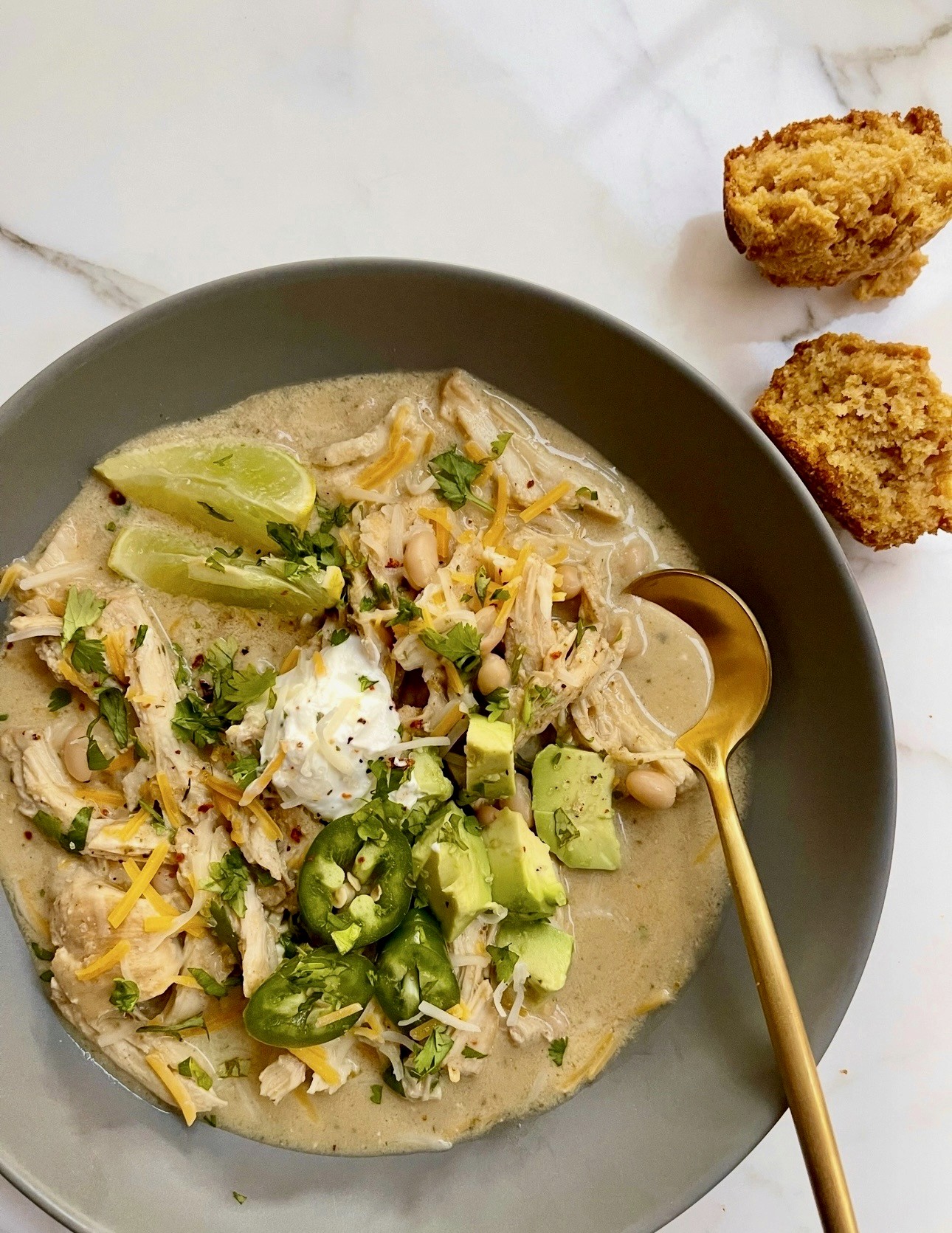 A rich, cozy bowl of creamy white chicken chili loaded with tender chicken, warm spices, and melty cheeses for the ultimate comfort meal.