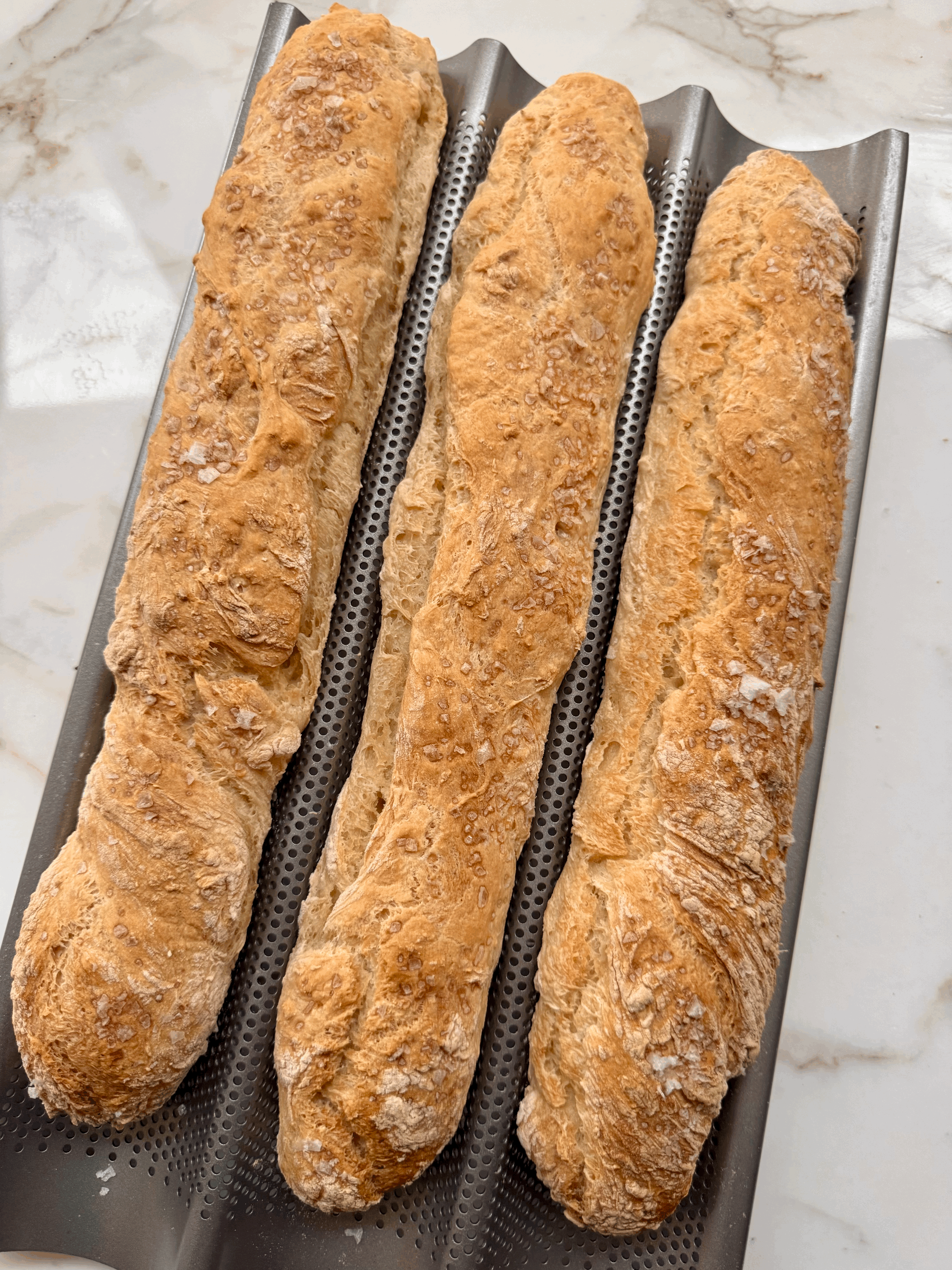 Warm, golden baguettes with a crackly crust and soft, airy center—freshly baked the very same day
