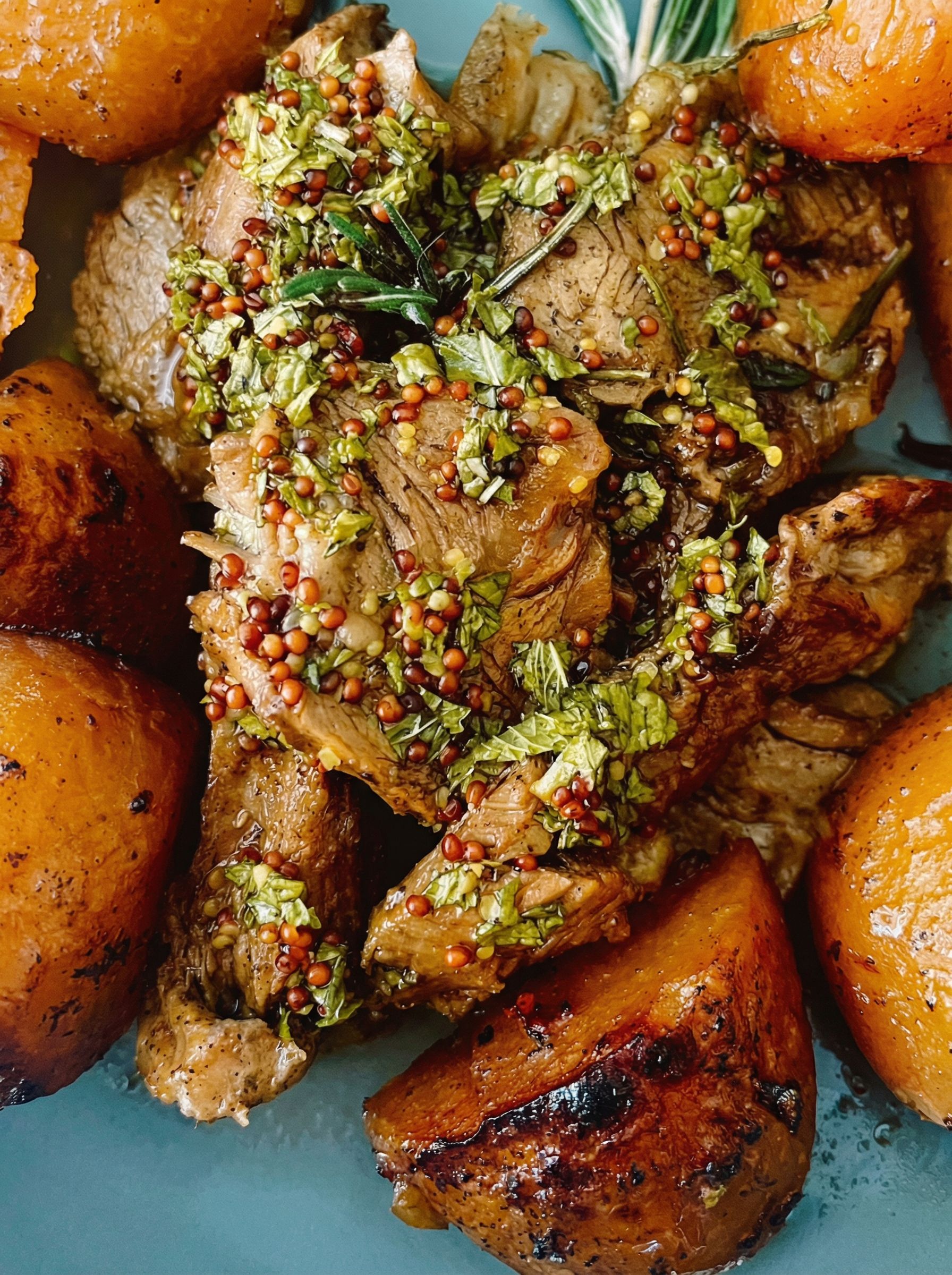 Slice the lamb, arrange it on a platter with the potatoes, and drizzle generously with the fresh mint sauce. Pair with seasonal sides for a feast-worthy holiday table.